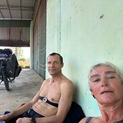 Gegen 12h mittags geht gar nichts mehr. An einem überdachten Vorplatz eines Hauses, auch hier ein Wasserhahn zum Hemd und Kopf nass machen, suchen wir in Booking.com nach einer Ausheil-Bleibe.