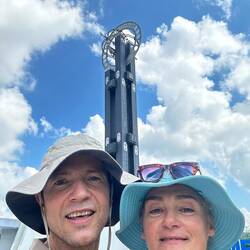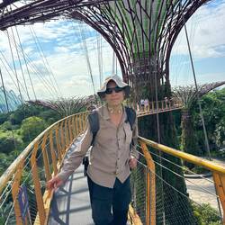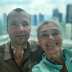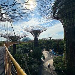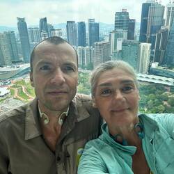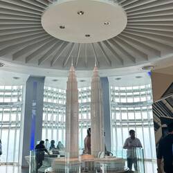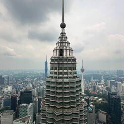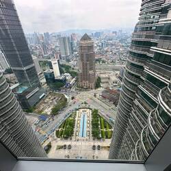 Genau dort lernten wir Conrad aus Polen, 29 Jahre jung,kennen, kommend aus Indonesien und jetzt hier in Kuala Lumpur. Wir plauderten in perfektem Englisch und er konnte uns viel über unser nächsstes Reiseziel erzählen.,er machte ein tolles Foto von uns, dann tauschten wir noch Kontaktdaten aus, und dann gings schon los zum Fahrstuhl in den linken Turm. Es ging bis in den 41. Stock, zur Brücke, die höchste der Welt, die beide Türme verbindet. Tolle Architektur! Danach ein weiterer schmälerer Aufzug hinauf bis in den 83. Stock. Phenomenale Aussicht!
