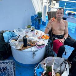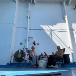 Wir machen uns auf die Suche, finden eine offene Türe, die auf das offene Decke am Heck des Schiffes führt. Hier frühstücken wir gemütlich im Schatten, ein Eisenzylinder dient uns als Tisch. Wir haben unsere Campingstühle aufgestellt und es ist gemütlich.