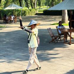 Dann gehts auch schon los. Wir marschieren vom Parkplatz über kleine Basare mit viel Ramsch Richtung Eingang. Unser Online-Ticket wird gescannt, dann gehts zum E-Auto, das uns durch viel Grün näher an den Tempel heranbringt.