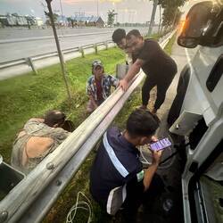 Der erste, der uns 20 l abnimmt und aus dem Kanister in seinen Tank befördert, ist ein junger Lkw-Fahrer. Danach kommt ein Security der Rest Area und will uns helfen.