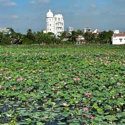Nachmittags kommen wir an einer riesigen Statue einer indischen Göttin vorbei, die gerade in Bau ist. Wir schätzen sie ca. 70 m hoch, noch dazu steht sie auf einem Hügel und blickt auf die Brücke und den Fluss. Wir machen im Park vor der Brücke unser Mittags-Dinner und können direkt an den vielen Wasserentnahmehähnen im Park unseren Kopf abkühlen und unser Geschirr abwaschen. Herrlich, endlich nicht Wasser sparen müssen.