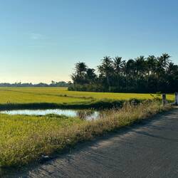 Gleich frühmorgens gehts durch liebliche Dörfer in Strandnähe, mit viel Grün und dazwischen Reisfelder. Es ist wundervoll, hier entspannt früh morgens durchzuradeln. Ein paar kleine Anstiege haben wir auch zu bewältigen.