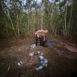 Alex hatte noch 3 Wasserflaschen gekauft, und eine verwendeten wir nun zum Duschen. Wir füllten das Wasser in meine Radflasche um und hatten so einen perfekten Duschstrahl, mit dem wir die Peelingmaske entfernen und uns mal richtig fein duschen konnten. Alex teilt immer ganz lieb mit mir, er einen halben Liter Wasser und ich bekomme einen Liter.
