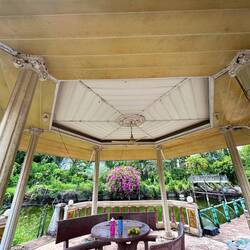 Unser Mittags-Abendessen legen wir auf die heißeste Zeit des Tages, also heute 12h. Und es bietet sich ein „Lost Place“ der besonderen Art an: ein aufgelassenes Resort, am Rande einer kleinen Stadt, mit Teich und überdachtem Sitzplatz mitten im Teich, sogar Tisch und Bänke gibt es hier.
