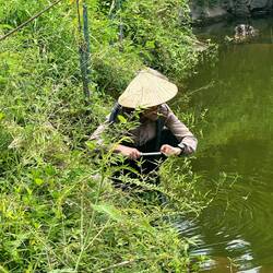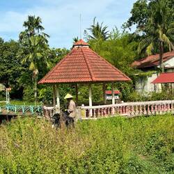 Noch direkt auf der Brücke ist mein Lieblings-Service-Mann zur Stelle und wir können gemeinsam einen neuen Schlauch einpflegen. Weiter gehts durch viele Dörfer, und viele Reisfelder. Es ist schon fast 17 h, als wir inmitten von Reisfeldern einen kleinen Wald mit höheren Bäumen sehen. Ein kleiner Weg führt durchs Reisfeld, total schmal, und links und rechts steht der Reis im Wasser. Und auch wir beide müssen in den Schlamm reinsteigen. Der Weg zum Wald ist durch eine Wasserrinne unterbrochen, durch die wir die Räder durchschieben müssen. Endlich, einen Platz unter den Bäumen gefunden, egal, dass die Schuhe gatschig sind und stinken.