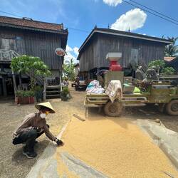 Auch Reis wird überall getrocknet, kann sogar sein, daß es nur mehr einen Fahrbahnstreifen gibt, weil am anderen die Planen mit dem zu trocknen aufgestreuten Reis platziert sind. Ab und an sehen wir die Leute mit Schubern den Reis umschichten.