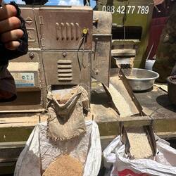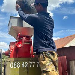 Wieder geht es auf der Hauptstraße durch die Dörfer. Ein besonderes Erlebnis war das Zusehen, wie der getrocknete Reis entspelzt wurde und an einer anderen Maschine poliert wurde und die weißen Reisperlen in einen Sack landeten.