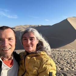 Alex wollte unbedingt noch die höhere Sanddüne besteigen, welche nicht mit einer Leiter als Steighilfe ausgerüstet war. Ich machte mich stattdessen wieder auf den Weg die Sanddüne abwärts. Ich wollte unbedingt den halbmondförmigen See mit den schönen Gebäuden in den Sanddünen im untergehenden Licht der Sonne noch genießen.