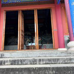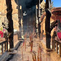 Dort erstehe ich ein mit Schoko gefülltes Croissant, Ananas-Limetten Marmelade und ein Baguette. So zufrieden mit meinem Einkauf kann ich auch noch die weitere Anstrengung in Kauf nehmen und auf einem Bein den Tempel besichtigen. Alex ist bei den Stiegen immer hinter mir, damit er mich gegeben Fall auffangen kann.