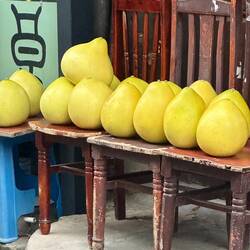 Alex bringt wieder viele fremdartige Früchte mit. Eine sehr spezielle ist dabei, die kann er selber essen. Heißt Durian, stinkt bestialisch fermentiert, andererseits süß - für Alex. Für mich nach süßen faulen Eiern, außerdem sieht sie aus wie eine gelb-weißliche riesige Eiterbeule. Nix für mich. Der ganze Kühlschrank stinkt.