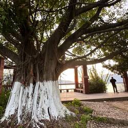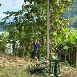 Eine Rampe führt hinunter zum Fluss, Alex nutzt ihn gleich für ein ausgiebiges Bad. Ich humple hinunter, um endlich wieder mal ein paar schöne Fotos zu machen. Dabei entdecke ich meinen ersten Papaja- Baum! Dort hängen sie also, so sieht das aus, und mit meiner Krücke kann ich eine herunterholen.Alex holt uns dann später noch ein paar Früchte mehr herunter. Nachts brauche ich ein Ibuprofen, der Fuß beginnt in Ruhelage weh zu tun, zu arbeiten und ich kann dann meist nicht einschlafen bis das Mittel wirkt.Read more