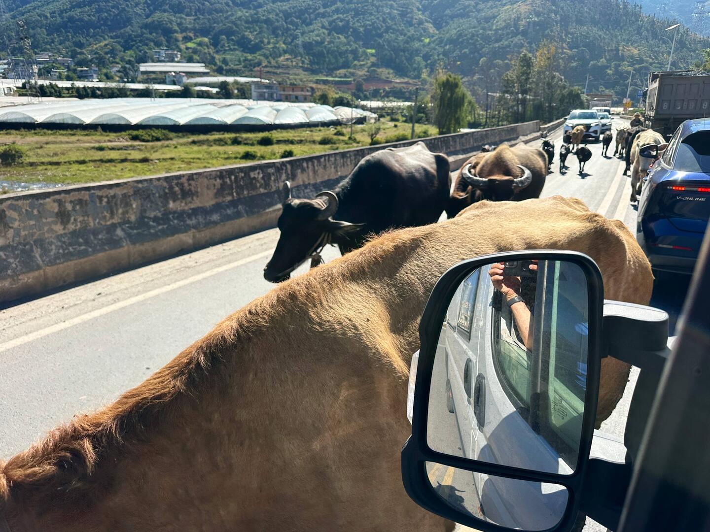 Heute um 11h sollen wir uns alle an der Grenze treffen. Diese ist von Jinghong noch ca. 180 km weit weg. Autobahn. Irgendwie kommen wir alle später weg. Frühstück gegessen wird wieder während des Fahrens, um Zeit zu sparen.