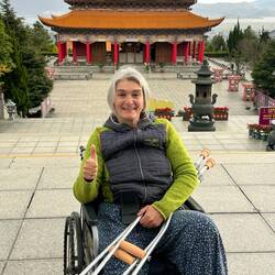 Heute machen wir uns auf den Weg nach Luang Prabang, einer relativ großen Stadt am Mekong. Kurz vor dem Zentrum biegen wir noch in das Chinesisch-Laotische Spital ein. Dort sind chinesische Ärzte beschäftigt, sie haben Röntgen und ein CT-Gerät. Es gibt sogar einen Rollstuhl, mit dem ich die Rampe hinunter in den CT-Betonbunker gebracht werde. Die zarte chinesische Krankenschwester will den Rolli hinunterschieben. Voller Angst bitte ich Alex dies zu tun. Ich will ja auch heil da unten im CT-Raum ankommen.