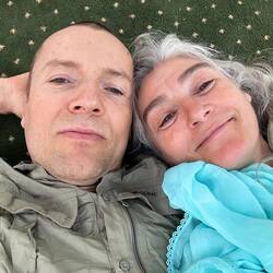 Yoga Morgenroutine, auf der Wiese neben Kohbi. Dann macht Alex sich wieder ans Werk.