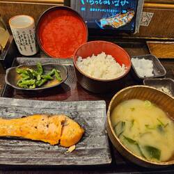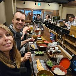 Retour à l'hôtel vers 19h passage aux bains (le post spécial choses inhabituelles du Japon vient bientôt !) puis on ressort pour manger. On passe dans Omoide Yokocho des minis allées avec des minis restaurants ( 3-6 personnes max!!) c'est très mignon et marrant à faire mais niveau prix c'est attrape touristes, on prendre quelques brochettes poulet et légumes délicieuses puis on trouve un resto typique pour manger du saumon délicieux 🤤avec j'en soupe et du riz 🍚 ( plateau en photo le tout pour 900 yen par personne soit 5 Euros). Retour a l'hôtel à minuit, encore une bonne grosse journée et 22km ( oups c'est loupé pour le moins marcher!).Read more