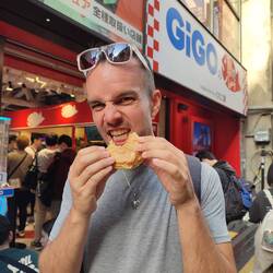 Ensuite metro 🚇 jusqu'àu quartier D'asakusa vieux Tokyo au nord West de la ville pour la visite du temple Sensō Ji. On débarque dans une énorme foule avec beaucoup de touristes autant Japonais qu'étranger. C'est la cohue mais une cohue organisé à la Japonaise. Dur a décrire mais ici même dans la foule on se sent plutôt bien. On défilé sur la rue centrale qui mène au temple avec ses magasins de souvenirs ( il y a des biblots 🐱 de partout!!) et beaucoup de stands de snacks sucrés inconnue (je regrette l'arrêt au café 🇫🇷) j'ai vraiment pas faim mais j'ai envie de goûter plein de chose, Jérémy teste une brochette de riz gluant sucré sauce un peu soja.
