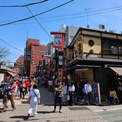 Le temple rouge et ces pavillons sont magnifiques, très bonne ambiance, des signes japonais de partout 🥰. On se balade ensuite dans les alentours, des ruelles très mignonnes et des allées couvertes (toujours blindé de monde) des magasins de vêtements traditionnels, de souvenirs, de couteaux ( trop beaux !) et restaurants de partout, vraiment sympa ce quartier. On se prend des petits snacks inconnus salé dans la rue, des beignets au curry et a là viande, frits et vapeurs, très bons! Toujours pas de place pour du sucré dommage on reviendra peut être dans ce quartier pour notre dernière nuit à Tokyo!