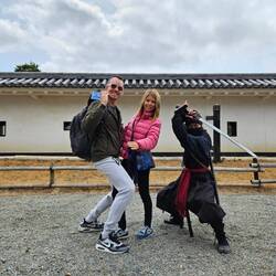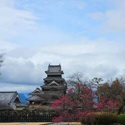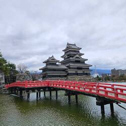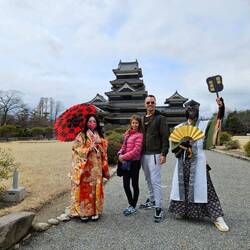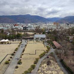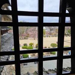 Ensuite on va visiter ce pourquoi on était venu: le château de Matsumoto, il est entouré de jardins, la zone et super jolie, il manque juste un peu de soleil. Encore ici c'est pas la pleine floraison des cerisiers mais on en trouve un fleurit par-ci par-là 💮. Le château est en bois noir, il est imposant, on fait aussi la visite de l'intérieur, tout en bois avec des parquets et grosses poutres et des escaliers très pentus (jusqu'à 60° d'inclinaison) qui nous emmènent jusqu'au 7ème étage avec une vue sympa sur la ville. Il y a aussi une collection de vieux pistolets japonais recouvert de bois.