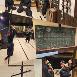 On avait booké un cours de Ninja que m'avait recommandé une amie donc c'est bien au moins on sera à l'intérieur sans regret. On file vers 9h avec notre thé dans la gourde et on passe s'acheter des petits snacks sucrés dans un convenience store 🏪. Ensuite on arrive dans le monde des Ninja, la salle est super cool avec des tatamis et plein d'armes de Ninja dans tous les sens, des sabres, dagues, étoiles, fléchettes, 'griffes de chat',... On fait le cours avec 2 anglais et leur 2 enfants, ils sont cool donc c'est bonne ambiance. On apprend quelques techniques de méditation puis on passe à l'action avec des techniques de marches ninja, pour se faufiler dans se faire voir, savoir marcher dans une pièce avec des pics au sol sans se faire mal, maniement du sabre, technique pour passer au travers de portes secrètes sans se faire repérer, lancé de dague attaché à une ficelle, lancer de baguettes pointues, attaque avec une faucille, lançage de fléchette à la bouche. C'est vraiment stylé, la prof est bien et on apprend pas mal de chose aussi sur les Ninja on passe un bon moment, je vous laisse découvrir quelques photos.