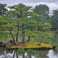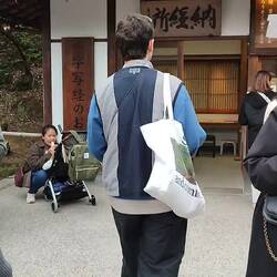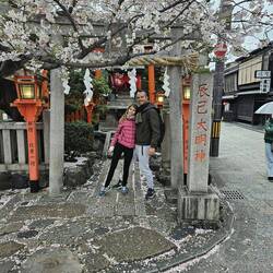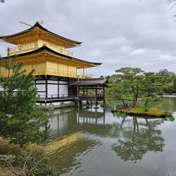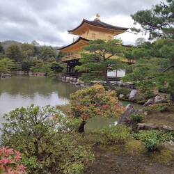 Vers 13h on prend la direction les jardins du palais impérial de Kyoto, la route est pas terrible mais une fois arrivé la bas trouve des beaux arbres, un joli mini temple et quelques Sakura en fleur. Ensuite on prend le 🚌 pour aller jusqu'au Kinkaku-ji, temple d'or, c'est un temple bouddhiste pas de Tori à l'entrée (qu'on avait prévu de visiter, il est inscrit au patrimoine de l'unesco) au nord de la ville car on a trop froid. Ce temple est unique le pavillon principal est vraiment doré flashy, à part le rez de chaussée, ça fait super joli dans la nature verte autour. Un beau contraste, on ne peut pas rentrer à l'intérieur, on fait le tour dans des jardins à la japonaise magnifique. On a la chance de voir un beau héron (je les aime trop, ils sont grand avec une peu de orange, c'est le héron des films 📽️ de Miyasaki 🤗).