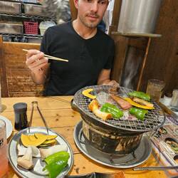 On repasse ensuite à l'hôtel prendre des vêtements plus chaud car ça c'est bien rafraîchit puis on file manger dans le quartier avec le canal. On a plus de jambe je pense on a dépassé les 20km today. On tourne pas mal de temps comme d'hab et Jerem choisit un resto de Yakitori (BBQ) avec du boeuf Waygu et des légumes surtout de la courge et des champignons, bien bon que l'on fait griller nous mêmes. Moins bon que le boeuf d'Hida mais quand même bien goutu. On rentre en roulant et en rampant façon de dire, presque minuit quand on se met au lit on est KO😴😴.