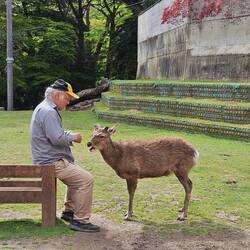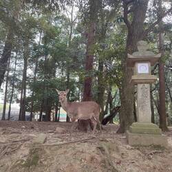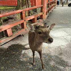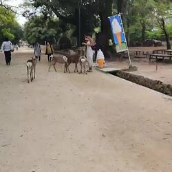 5min à peine en sortant de la gare on arrive dans le parc où il y des biches de partoooout, elles sont toutes calme super docile, tous les touristes leur donne des 'deer' crackers 🍘qu'ils ont acheté au petits stands au bord de la route. On se demande si ils mettent pas de la drogue dedans pour rendre les biches stones (lol) car elles se laissent caresser et tout! Ça fait un peu trop touriste crowded mais on reverra des biches dans les bois et les temples toute la journée c'est quand même bien stylé.