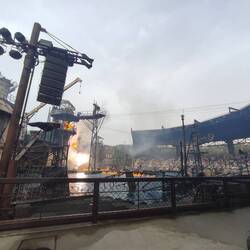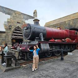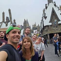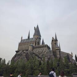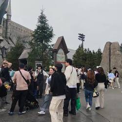 16h on file dans le monde d'Harry Potter la encore dès l'entrée c'est vraiment stylé et on s'y croit, je vous laisse également découvrir sur les photos mais ça fait vraiment réaliste une rue typique avec les petite maisons au toit pointu. On y retrouve le magasin de baguette magique, les fameuses bières au beurre, des petites créatures du films, et le château 🏰 est aussi super bien fait. L'attraction principale est dedans mais c'est dommage car la queue est dehors et après on traverse une partie du château vite fait pour arriver à l'attraction alors que c'est super joli et plein de détails. L'attraction est vraiment stylé et ça change de genre. On est assis de travers (de côté et pas dans le sens de la marche) et ça nous emmène sur un circuit dans et autour du château (en virtuel avec des immenses écran le dehors) et ça simule tout le long qu'on vole sur un balais c'est vraiment cool. Les descentes on a l'impression qu'on descend énormément juste avec les effets visuels et les vibrations car en fait notre siège ne bouge pas énormément ! Une belle prouesse technologique.