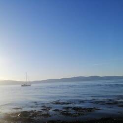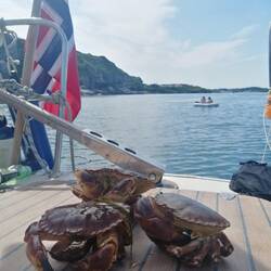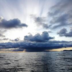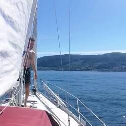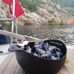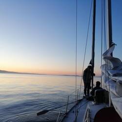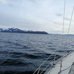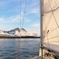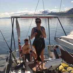 Still waiting for good weather to cross, so we anchered for the night and sailed to Maloy to shelter from the strom that was coming. Amazing weather as you can see Lauti took one for the team. LuckilyLæs mere