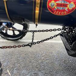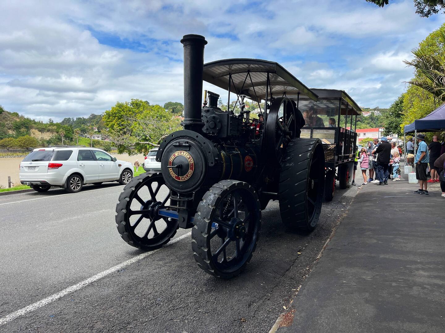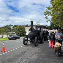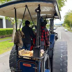 Die lokalen Dampfmaschinen-Freunde boten mit zwei dampfbetriebenen Traktoren Rundfahrten für 3 $ pro Person an. Markus war sehr begeistert: Mit einer Lenkstange, einer Getriebeschnecke und einer langen Kette wurde die Achse bewegt und damit gelenkt.