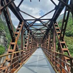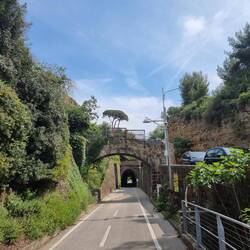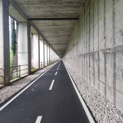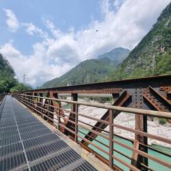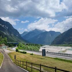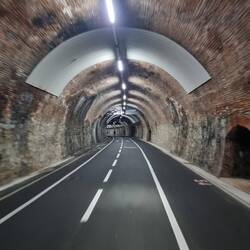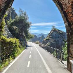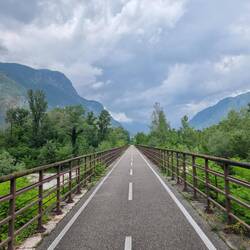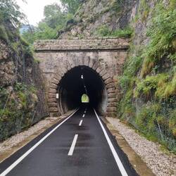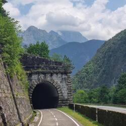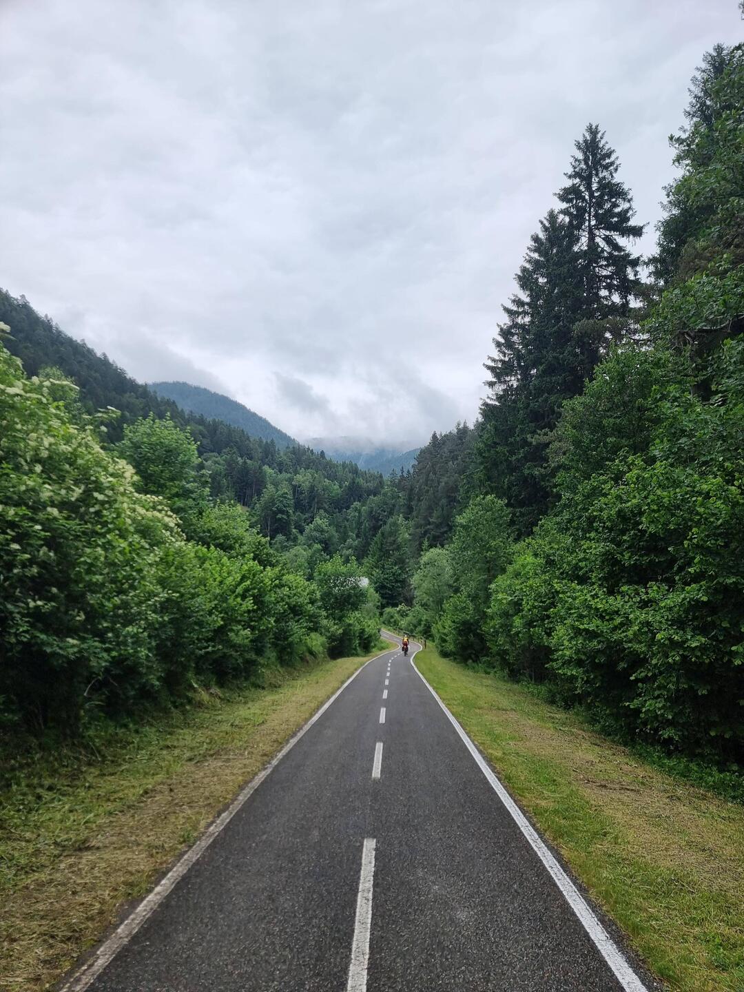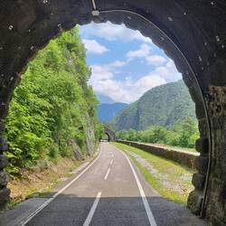 Der Radweg folgt einer alten Bahntrasse – das bedeutet: angenehm gleichmäßige Steigung, viele Tunnel und vor allem: keine Autos. Die Landschaft ist der Wahnsinn. Fast übergangslos wechselte alles vom mediterranen Flair in alpine Kulisse. Das Licht, die Pflanzen, die Luft – alles plötzlich ganz anders.