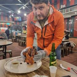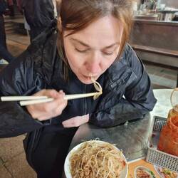 Auf dem Weg sahen wir überall Tonöfen in denen Hähnchen geröstet wurden. Ein Dorf hatte sogar eine ca 8m hohe Statue aus Gold dem Huhn gewidmet. Leider konnten wir im Nachbarort in der wir übernachten kein solches Huhn finden. Da half auch Google translate nichts. Laut Internet ist es wohl teilweise nur zu 50% akkurat beim Übersetzen von Mandarin. Das erklärt, warum uns die Gastgeberin zu KFC schicke🤣. Wir entschieden uns für ein anderes Restaurant und bestellten mit Hilfe von Google Lens (gold wert) Steak und Koteletts mit Nudeln auf einer heißen Platte. Danach versuchten wir den berühmten Bubble-Tea.....joa ....is okeh😅.Weiterlesen