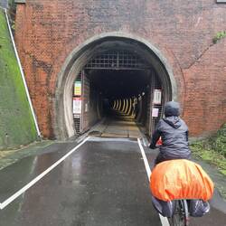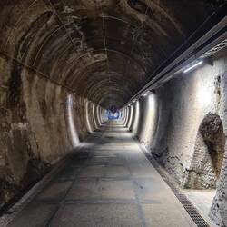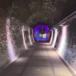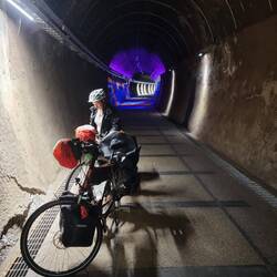 Also fuhren wir bibbernd weiter. Auf dem Weg kam zum Glück ein 2 km langer Kohlestollen der zum Radweg (mit psychedelischer Beleuchtung 😅) ausgebaut wurde.