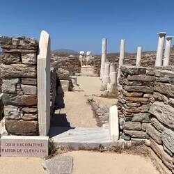 Von den Prachtbauten des Altertums sind überwiegend nur noch die Grundrisse und Mauerreste vorhanden. Das gesamte Gelände ist von Trümmern übersät. Einige rekonstruierte Säulen lassen die frühere Pracht jedoch erahnen. Oberhalb der Heiligtümer und Tempel lag die rasch wachsende Stadt am Berghang. Hier sind die Häuser zumindest im Erdgeschossbereich noch gut erhalten. In Erinnerung bleiben uns das Haus der Kleopatra mit einigen Säulen und zwei Statuen des Ehepaares, sowie das Haus des Dyonisos mit Fussbodenmosaiken, die aber vor Besuchern recht abgeschirmt sind.