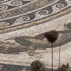 Was uns besonders beeindruckte war, dass in der gesamten von uns besichtigten Stadt unter den Straßen und Wegen eine Kanalisation verlief, die offenbar sehr ausgeklügelt das natürliche Gefälle nutzte. An einigen Stellen sind die alten ursprünglichen Gewehgplatten stark verwittert und gewähren Einblick in das darunterliegende Hohlraumsystem. Im Rund eines antiken Sees wächst heute noch ein kleiner Nadelwald… offenbar ist hier an der tiefsten Stelle immer noch genug Feuchtigkeit für die Pflanzen vorhanden. Wir setzten uns in deren Schatten um in der gleissenden Hitze etwas zu trinken.