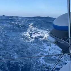 Als dann die Dämmerung einsetzte, sah man zum ersten Mal die Wasserberge, die jetzt anrollten. Ich hatte sowas ja noch nie gesehen! Die Wellen im Mittelmeer sind wesentlich kürzer, hier auf dem Atlantik langgestreckter. Es war schon ein Schauspiel. Immer, wenn man dachte „ auweh, jetzt wird es gleich nass“ hob sich das Heck an und die Welle rauschte einfach unter dem Boot durch.