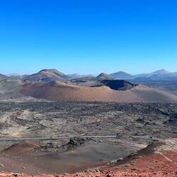 Der Nationalpark von Timanfaya war eine unserer weiteren Stationen. Der Eintritt zum Gelände beinhaltet eine gut halbstündige Bustour mit Erläuterungen in mehreren Sprachen. Man wird durch die wilde Kraterlandschaft gefahren und an besonders eindrucksvollen Spots hält der Bus auch an. Kurze Haltepunkte mit Ausstieg aus dem Bus und vlt. ein kurzer Marsch durchs Lavagestein hätten mir persönlich noch mehr gefallen. Dann hätte man auch mal Bilder ohne Fensterglas oder Köpfen von Nachbarinsassen aufnehmen können. Zum Abschluss der Busfahrt gab’s eine hochschiessende Dampffontäne infolge unterirdischen Erhitzens eines Eimers voll eingegossenem Wasser als Showeffekt und den Blick auf den Grill des Restaurants, der über einem Loch thront, das von unten nur vom Vulkan beheizt wird. Vorbildlich energieeffizient!