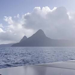 Ca. 7 Uhr soll die heutige Überfahrt beginnen. Da aber die Boje, an der wir hängen, ständig ans Boot bumst, beschließe ich schon um 5:00 aufzustehen. Ich mache in aller Ruhe das Boot klar, steige nochmal kurz ins Wasser, und um 6:00 Uhr löse ich die Leinen zu unserer Boje. Das Großsegel habe ich schon hochgezogen, und so kann es losgehen, anfangs noch ein kleines Stück unter Motor, dann aber gleich unter Segeln. Es soll in Luv an der Insel St. Vincent vorbei gehen, da auf der Leeseite mit drehenden und eher wenig Wind zu rechnen ist. Zwischen St. Lucia und St. Vincent erwischt uns dann ein Squall. Das ist nicht weiter tragisch. Gerefft habe ich eh schon. Die Großschot etwas gefiert und alles ist gut. Denkste! Der Wind dreht von 102 auf 150° und ich kann den Kurs nicht mehr halten. Wir versetzen uns sehr weit Richtung Süden. Als der ganze Spuk nach ca. einer Stunde vorbei ist, versuche ich wieder auf Kurs zu gehen. Der Winkel ist nun aber zu spitz für uns geworden. Ich entscheide mich daher in Lee an St. Vincent vorbeizusegeln. Das ist, wie berichtet, nicht die erste Wahl, aber die sicherere Variante. In Höhe der Insel erreichen uns wieder Squalls. Sie ziehen aber entweder hinter oder vor uns durch, Glück gehabt. Wir kommen auch an der Bucht, die als Drehort von „Fluch der Karibik" diente, vorbei. Es wird aber von aufdringlichen Boatboys berichtet, und so lassen wir die Bucht im Kielwasser liegen. Am Ende von St. Vincent frischt der Wind wieder auf. Wir machen gut Fahrt durchs Wasser. Aber wie schon vor der Insel haben wir auch jetzt wieder mit erheblicher Strömung gegen uns zu kämpfen. Diese kommt mit bis zu 2 Ktn. von vorn, da ist kein Blumenpott mit zu gewinnen.