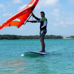 Schön waren die gemeinsamen Unternehmungen mit unserem Freund Lutz von der „Mahana“. Der nahm Uwe auch mit zu dem bekannten Surf-Strand …. in einer Bucht, wo es viel Wind aber wenig Wellen gibt. In Tonky Frans fand Uwe einen tollen Lehrer in der dortigen Surfschule der Brüder Frans, der auch weltbekannter Showkünstler im Wingfoilen ist. Aber aller Anfang war schwer… Üblicherweise startet man mit einem Surfbrett mit Kiel, um zunächst den Umgang mit dem Wing zu üben. Zum Schluss konnte Uwe dann aufs Foilboard wechseln, allerdings ein deutlich größeres und damit standstabileres als sein eigenes hier an Bord.