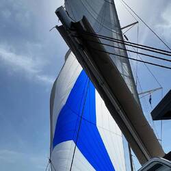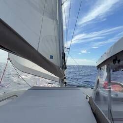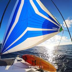 In die letzte Nacht hinein ging es noch mit dem Gennaker und dem Groß. Zu Doris Schicht ab 24.00 Uhr wechselten wir auf die Genua. Später ließ der Wind leider nach, und unsere Schiebehilfe musste ran. Nach dem Frühstück entschieden wir uns in Absprache mit Werner und Resi zunächst, die Motoren abzustellen und den Rest der Reise gemütlich zu segeln. Zu der Zeit herrschten noch 12 kt. Wind, leider direkt von hinten. Für uns Segler nach dem Wind direkt von vorn der zweit ungünstigste Wind 🙄. Wenig später kam von unserem Partnerboot die Info, sie würden die restlichen 200 sm doch mit Motor zurücklegen, zu mühselig erschien ihnen das langsame Dahinschaukeln mit schlagenden da unterbeschäftigten Segeln.