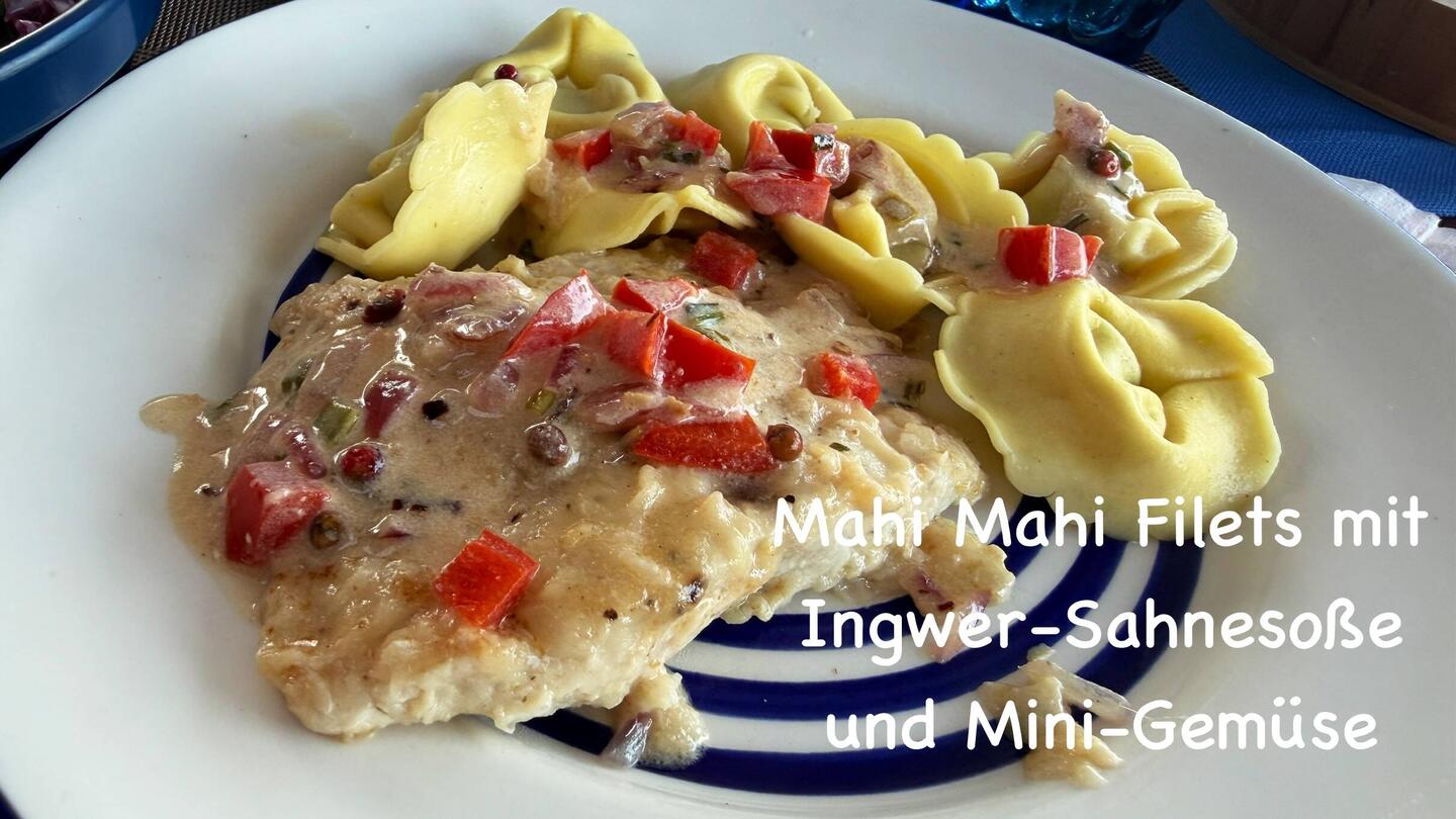 Heute gab es zur Feier des Tages Mahi Mahi mit Ingwer-Sahnesauce und Spinattortellini, begleitet von gemischtem Salat, und danach ein Creme Dessert mit Früchten. So lässt es sich leben auf einer Ozeanpassage.Read more