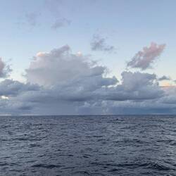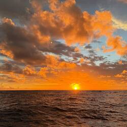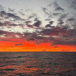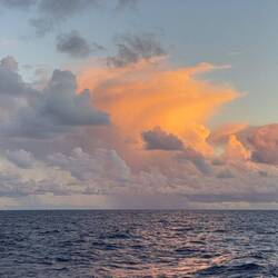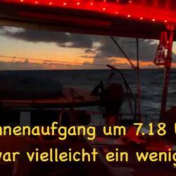 In der Früh hatten wir es dann tatsächlich geschafft, hinter uns die enorme Wolkenbank, die im Licht der Morgensonne gar nicht mehr so bedrohlich wirkte. Um uns herum lungerten aber immer noch einige Squalls, welche uns jedoch in Ruhe ließen. Die Zeit war gekommen, wieder mal die Segel rauszuholen. Was dann folgte, habt ihr gerade gelesen. Es ist der Endspurt nach Gambier, zwei drei Tage noch, je nachdem, wie uns der Wind gewogen sein wird. Wir haben Zeit. Die Unwetter sind verzogen. Wir genießen jetzt die letzten Meilen dieser langen Reise und freuen uns über einen herrlichen Sonnenuntergang.
