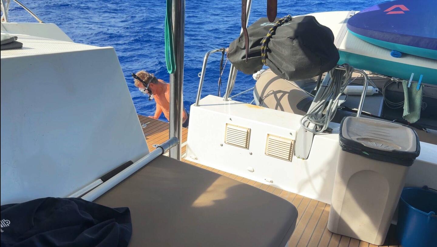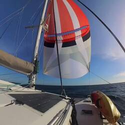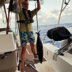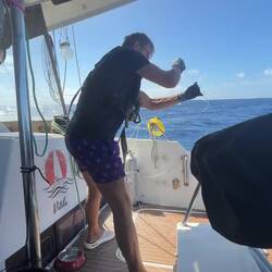 Die Nacht war wieder super, viel Wind, für Doris fast ein bisschen zu viel…. Muss man sich erst einmal wieder dran gewöhnen. Keine Squalls weit und breit, und der volle Mond erhellte die Nacht. Die Wellen waren etwas konfus, das macht das Gehen auf unserem Kat etwas anstrengend. Normales Essen und auch Kochen, sowie andere kleine Tätigkeiten sind aber nach wie vor möglich, im Gegensatz zu einem Mono 😉.
