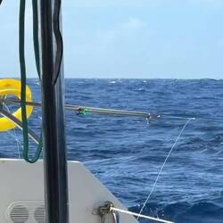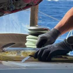 Dann alle Vorbereitungen treffen, Werkzeuge und Schnaps in der Sprühflasche bereitlegen, Rettungsweste anziehen, und dann ging es los. Oh, da zog was ganz schön. Ein Mahi Mahi konnte es nicht sein. Wenn diese ermüdet sind, schwimmen sie obenauf und können leicht herangezogen werden. Dieser Bursche war schwer, er hörte nicht auf zu kämpfen. Die Angelsehne schnitt sogar meinen Handschuh durch. Ich benutze längst keine Angelruten mehr, sondern ein ganz einfaches Setup aus Spule mit relativ dicker Schnur, welche ich einfach über eine Stütze hänge.