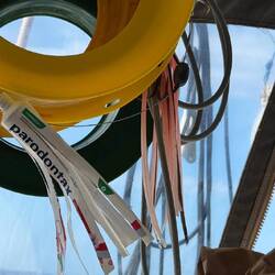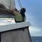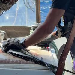 Mit einer Grimpzange (Zange die sich arretiert) am Reißverschluss ansetzen und alles aus dem Block ziehen funktionierte auch nicht. Vielleicht würde ein anderer Zugwinkel, direkt am Baum, etwas bewirken? Nächster Versuch. Nichts. Keine Regung. Dann half der Baum selber mit: durch eine Welle ruckte er kräftig ein, ba-a-mmm, mit einem tüchtigen Knall löste sich der Reißverschluss aus seinem Gefängnis, und ein Seitenteil des Blockes verabschiedete sich gleich mit. Not-Reparatur also doch noch geglückt.