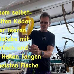 Und tatsächlich, es hatte ein ordentlicher Mahi Mahi angebissen, 80 cm lang, 2 Mahlzeiten schwer. Das war der erste Biss nach Monaten erfolglosen Angelns! Und das eindeutig erzielt wieder mal mit unserer leeren Zahnpastatube. Das gibt ein feines Osteressen 😌.Read more