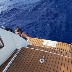 Leider hielt der Wind nicht lange. Wir nutzen diese Gelegenheit, um uns im Meer kurz frisch zu machen. Herrlich war das mal wieder! Kurze Zeit später musste ich den Gennaker wieder bergen.