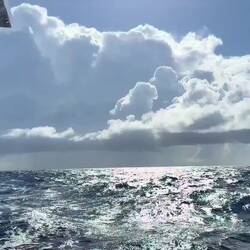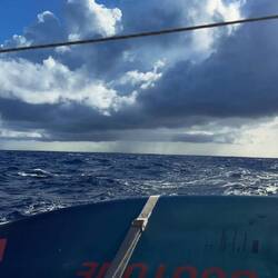 In der Ferne waren schon die Wolken der innertropischen Konvergenzzone (ITCZ) zu sehen. Diese sorgt für Regen und kräftige Gewitter. Der Wind blies immer noch ausreichend, und wir kamen gut mit unserem Gennaker voran. Doris hatte gut geschlafen und kam etwas später aus dem Schlafgemach. Alles ging dann seinen gewohnten Gang, Frühstück machen, schön essen, bisschen ins Handy schauen. Da dachte ich mir : kuck doch mal nach oben, wo Werner so bleibt, und wie ich auf meinen Plotter schaue, sehe ich ein gewaltiges Regenechos im Radar. Uff, der ganz Himmel vor uns war auch schon schwarz. Jetzt schnell das Leichtwindsegel rein und das erste Reff ins Groß, man weiß ja nie was kommt. Keine fünf Minuten später kamen die ersten Böen angeflogen, und im Nu war der Wind auf 18 Ktn geklettert. Der Regen ließ dann auch nicht mehr lange auf sich warten. Also immer, Holzauge sei wachsam.