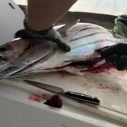 Nach mehreren Phasen des Anziehens und wieder Loslassens hatte ich die Beute bis ans Boot herangezogen. Es war ein großer dicker Bonito. Mein Gaff, das heute zum ersten Mal zum Einsatz kam, ging gleich beim ersten Hieb entzwei. Was soll’s, muss ich ihn halt so an der Schnur hochziehen, wie sonst auch. Ging auch ganz gut.