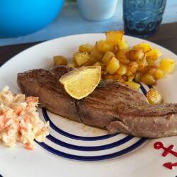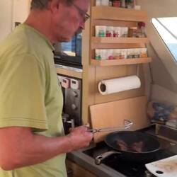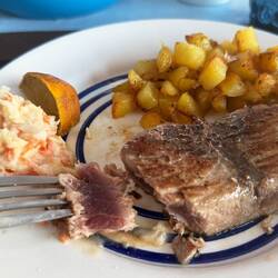 Zum Abendessen gibt es Steak vom Bonito mit Bratkartoffeln und - mmh - Coleslaw. Der Captain stellt sich heute selbst an die Pfanne, das Fett muss recht heiß sein, und er achtet darauf, dass die Filets ja nicht mehr als 2 Minuten von jeder Seite abbekommen. Das war schon mal sehr lecker. Varianten warten mit kleinen Soßen oder Thunfisch-Tartar, Ceviche oder - was wir in Medellin/Kolumbien kennenlernten - Tiradito .Read more